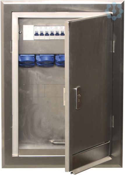 Edelstahl-Unterputzverteiler mit abschließbarer TürMaße: 420x212x580mm (BxTxH)Farbe: Sichtseiten geschliffen (K240)Ausführung: IP44 (bei geschlossener Tür)Werkstoff: V2A-Edelstahl, rostfrei (1.4301)Bestückung:2 x Schutzkontakt-Steckdose 16A, 2P+E, 230V1 x CEE 16A, 5P, 400V1 x CEE 32A, 5P, 400VAbsicherung:2 x LS 16A, C, 1P1 x LS 16A, C, 3P1 x LS 32A, C, 3P1 x FI 63/0,03A, 4P, XAMaueröffnung: B x H x T in mm = 400 x 550 x 212
