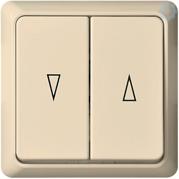 Jalousietaster. Farbe: reinweiß, mit mechanischer u. elektrischer Verriegelung gegen gleichzeitige Betätigung, nach Entfernung der Rückstellfeder auch als Jalousieschalter verwendbar, für Unterputzmontage. Schutzart IP 20, Taster 10 A, 250V AC, Rahmen und Wippen aus Thermoplast, auch einsetzbar in Geräteträger mit einer Einbautiefe von mindestens 32 mm. Steckklemmen: Klemmbereich für Informationsleitungen ab Leitungsdurchmesser 0,5mm, für Kupferleiter 1,5 mm und 2,5 mm.