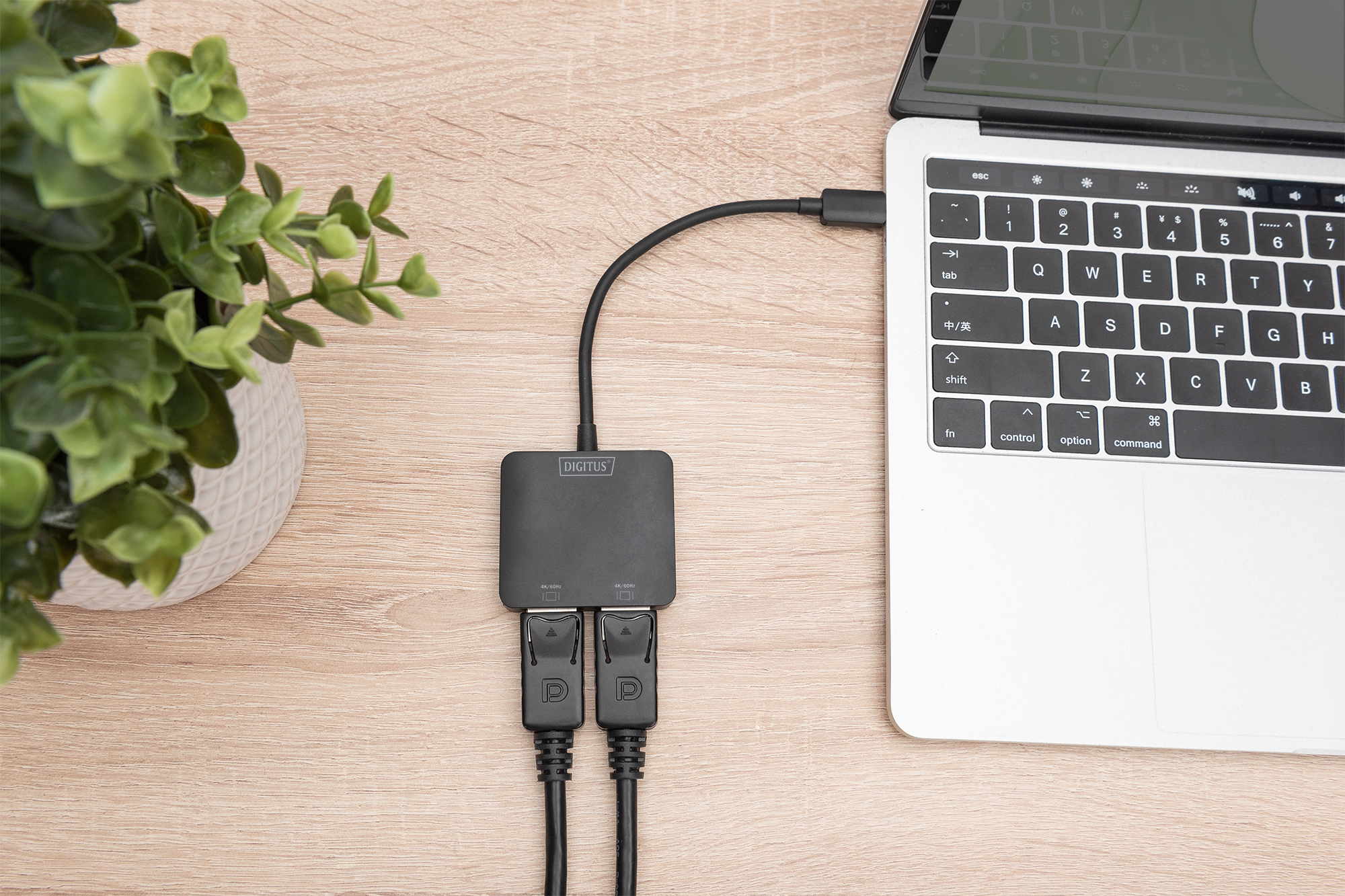 1.2-Funktion), mit der mehrere AV-Signale über ein einziges Kabel transportiert werden können. Dies ermöglicht die Verwendung mehrerer Monitore, die über die MST-Hub-Konfiguration verbunden sind. Die MST Hub kann unterschiedliche Videostreams an die zwei angeschlossenen Bildschirme verteilen. Generell werden drei Wiedergabe-Modi unterstützt: Spiegeln (1 Signal auf 2 Displays gespiegelt), Erweitern (2 Signale auf 2 Displays), Verteilen (1 Signal über 2 Displays verteilt).