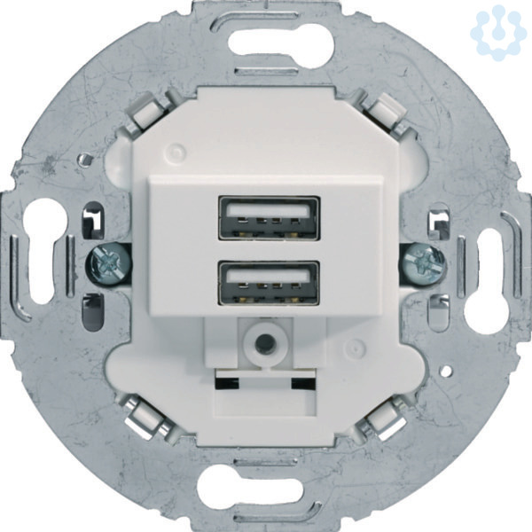 USB Ladesteckdose 230V, 2fach, 3.0A, runder Tragring, polarweiß matt. USB Ladesteckdose mit 2 USB-Buchsen Typ A zum Laden mobiler Endgeräte, wie z.B. Tablets, Smartphones, Navigationsgeräte und Digitalkameras über USB-Kabel, kurzschlussfest und überlastsicher (elektronische Sicherung), mit Schraubklemmen. Hinweis: Keine Datenübertragung möglich.