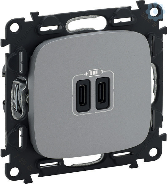 2-fach USB-Ladesteckdosen Typ C, USB-C-Stecker, lassen sich beidseitig einstecken, z. B. zum Laden von Smartphones, MP3-/MP4-Player und Tablets. Ausgangsspannung 5 V mit maximalem Ladestrom von 3000 mA bei einem Gerät oder 1500 mA pro Ausgang bei gleichzeitigem Laden von 2 Geräten. Schraubklemmenanschluss: 230 V~, 15W, Verbrauch im Standbymodus 0,075W, Geliefert inkl. Abdeckung, Ladekabel nicht im Lieferumfang enthalten. Farbe: Aluminium