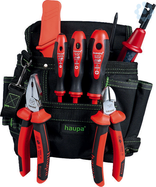 HAUPA ?ToolBelt VDE? 1000 V8 Taschen zur Organisation Ihrer Werkzeuge, verstärktes großes Hauptfach, Stahlnieten am höchsten Belastungspunkt gewährleisten maximale Haltbarkeit, große Vordertasche für Nägel oder Maßband, Hammerschlaufe und Bandhalter, verstellbarer Riemen passend für Taille bis 135 cm. Wasserdicht und schmutzabweisend, doppelte Kreuznaht für hohe Belastung, Material: extra starkes 600D Polyester, Farbe: grün, schwarz.Inhalt: ? 2K-Elektrikerschraubendreher ? 2K-Kreuzschlitzschraubendreher PH 1 + 2 ? 2K-Kombinationszange 205 mm ? 2K-Seitenschneider 165 mm ? 2K-Spannungsprüfer ?Basic? ? 2K-Kabelmesser, 1-teilig