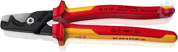 95 18 225 KNIPEX StepCut XL Mit Kraftgelenk, langen Schenkeln und optimierten Schneiden: spürbar leichterer Schnitt als mit kompakten Kabelscheren. Enorme Kapazität: trennt eindrähtige Kabel aus Kupfer oder Aluminium bis 35 mm², mehrdrähtig bis 70 mm² und feindrähtig bis 120 mm². Zwei Schneidbereiche: Die abgestufte Hauptschneide hält kleinere und größere Kabel beim Schnitt stets maximal gelenknah, die Frontschneide dient zum schrittweisen Trennen (?Knabbern?) sehr großer Kabel. Komfortable Einhand- und Zweihandbedienung auch bei großen Kabeldurchmessern durch minimierte Schenkelweite. Geschraubtes Kraftgelenk: hochübersetzt, leichtgängig, nachstellbar. Schlanker Kopf für bessere Zugänglichkeit. Klemmschutz für sicheres Arbeiten. Nicht geeignet für stahlverstärkte Kabel, etwa ACSR. Schneiden zusätzlich lasergehärtet, Schneidenhärte ca. 56 HRC..