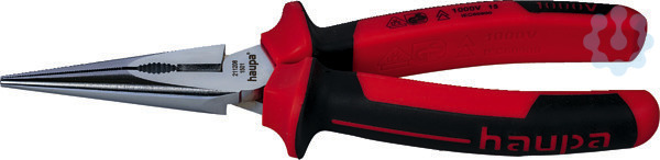 Storchschnabelzange DIN ISO 5745 VDEmit Drahtabschneider, gerade flachrunde Backen, C 45, ölgehärtet, Schneiden induktiv nachgehärtet, für harte Drähte, verchromt, gesteckte Hüllen, hebelübersetzt, perfektionierte Schneidkraft-Performance.
