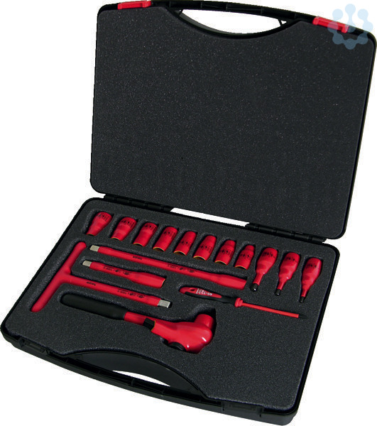 Knarrenkoffer 1000 VKunststoffkoffer mit Schaumstoffeinlage, mit 1/2?-Einsteckwerkzeugen. Maße: 450 x 340 x 100 mm.Inhalt: ? Umschaltknarre 1/2? ? Verlängerungen 1/2?, 125 und 250 mm ? T-Aufsteckschlüssel 1/2? ? Steckschlüsseleinsätze 1/2?, 10, 12, 13, 14, 17, 19, 22, 24 mm ? Einsätze für Innensechskantschrauben 1/2?, 5, 6, 8 mm ? 2K-VDE-Schraubendreher 3,5 x 100 mm mit Verriegelungssystem