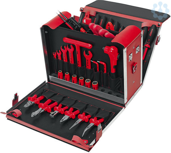 Werkzeugkoffer aus starkem Rindleder speziell für Sicherheitswerkzeuge und Schutzvorrichtungen, alle Außenkanten mit Alu-Winkeln verstärkt, Seitenteile, Vorder- und Rückwand, Boden und Deckel extra verstärkt, Vorderwand abklappbar, abschließbare Steckschlösser, Seitenverschlüsse, schwerer Stollen-Tragegriff, zahlreiche Werkzeugeinsteckfächer, seitliche Schlaufen für Schultertrageriemen, Bodengleiter zusätzlich mit Dokumenten-Vortasche, abklappbarer Rückwand, Klappfach für Kleinteile, Zwischenwand, Schaumstoffeinlage mit Aussparungen für Steckschlüsseleinsätze komplett mit 37 Sicherheitswerkzeugen (1000 Volt-Schutzisolation). Werkzeugkoffer-Bestückung: 1 x Flachzange (10 0796), 1 x Telefonzange, gerade (10 8778), 1 x Telefonzange, gebogen (10 8780), 1 x Kombinationszange (10 8782), 1 x Kraft-Seitenschneider (10 8784), 1 x Abisolierzange (10 8790), 1 x Winkelschraubendreher SW 5 (11 0804), 1 x Winkelschraubendreher SW 6 (11 0806), 1 x Spannungsprüfer (11 1432), 1 x Steckschlüsseleinsatz SW 10 (11 2600), 1 x Ste