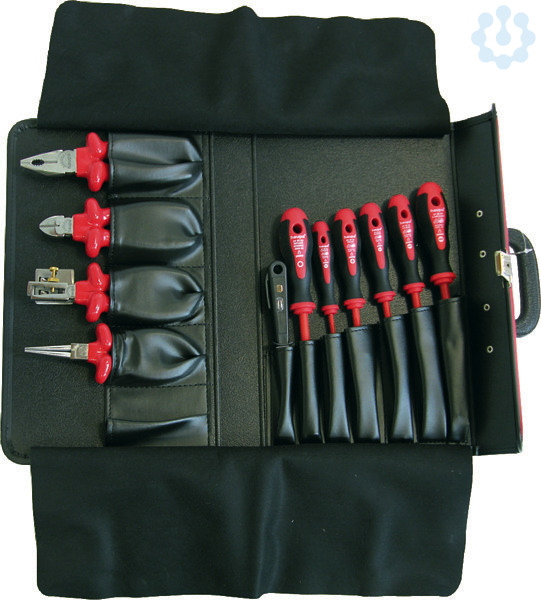 VDE/GS - Werkzeugsortiment 1000 Vin roter Klapptasche aus Kunstleder, 11-teilig.Inhalt: ? 2K-VDE-Elektrikerschraubendreher 2,5 x 75, 4 x 100, 5,5 x 125, 6,5 x 150 mm ? 2K-VDE-Kreuzschlitzschraubendreher PH, Gr. 1 ? 2K-VDE-Steckschlüssel 7 mm ? VDE-Kombinationszange 185 mm ? VDE-Rundzange 160 mm ? VDE-Seitenschneider 165 mm ? VDE-Abisolierzange 160 mm ? Spannungsprüfer