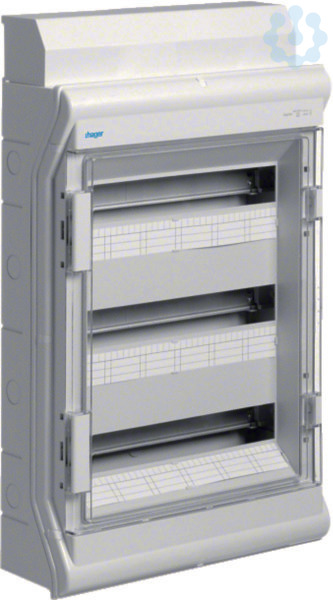 Kleinverteiler, vector, APV, IP65, 54PLE, mit Rangierkanal. Installationskleinverteiler AP aus Kunststoff, nach DIN EN 60670-24, nach DIN 43871. Zum Einbau von Geräten bis 63 A nach Maßnorm DIN 43 880 mit 70 mm oder 85 mm Einbautiefe, Bemessungsspannung AC 400 V/50 Hz. Bestehend aus Kunststoffunterteil mit Hutprofilschiene aus verzinktem Stahlblech, Vorprägung für metrische Leitungseinführungstüllen (oben, unten), seitliche Vorprägungen für Verbindungstüllen zur Verbindung von zwei oder mehreren Verteilern nebeneinander. Eingebaute PE/N-Klemmen Schnellsteckklemme, Oberteil mit 46 mm Geräteschlitz. Klarsichttür frontbündig, rechts oder links anschlagbar, plombierbar, abschließbar, Verteiler anflanschbar.