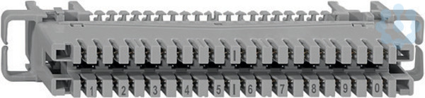 Verbindungselement VE 10 LSA, Verbindungselement mit LSA-Kontakten, löt-/schraub-/abisolierfreie Anschlusstechnik, - LSA-Klemmen der VE sind für Massivleiter mit 0,4 bis 0,8mm Durchmesser geeignet oder, für zwei gleiche Massivleiter mit 0,4 bis 0,65 mm Durchmesser geeignet, - Isolierungsaußendurchmesser 0,7 bis 1,6 mm., - LSA-Klemmen für Erdbeidrähte sind für Massivleiter mit 0,4 bis 0,8 mm Durchmesser geeignet, - Isolierkörper der VE 10 aus PBT-Formmasse, lichtgrau (ähnlich RAL 7035), - Kontakte aus Messing, versilbert