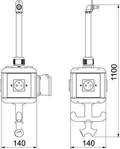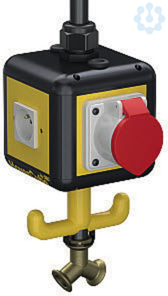Gehäuse mit 1 m Rohr 1/2? mit Anschluss für Druckluftschlauch 13 x 3,5 mm und 2-Wege-Verteiler 1/2?. Gehäuse mit Aufhängeöse und Griffhaken und mit 4 Abdeckplatten. Bestückt wie folgt: 1 x Klemmen 3-polig, 3 x 1fach Steckdosen mit Erdungsstift 16 A/250 V mit erhöhtem Berührungsschutz, auf einen Wechselstromkreise vorverdrahtet. 1 x CEE-Steckdose 16 A/415 V.