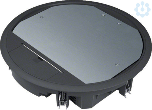 Versorgungseinheit R10 rund 275mm für 5mm Bodenbelag aus Polyamid tiefschwarz. Versorgungseinheit nach DIN EN 50085-1 und DIN EN 50085-2-2, inklusive Universal-Befestigungsset, mit Belagschutzrahmen, Gerätebecher stufenweise bis 18 mm absenkbar, mit Anschlussmöglichkeit für Flachkette.