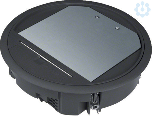 Versorgungseinheit R06 rund 215mm für 5mm Bodenbelag aus Polyamid tiefschwarz. Versorgungseinheit nach DIN EN 50085-1 und DIN EN 50085-2-2, inklusive Universal-Befestigungsset, mit Belagschutzrahmen, Gerätebecher stufenweise bis 18 mm absenkbar, mit Anschlussmöglichkeit für Flachkette.