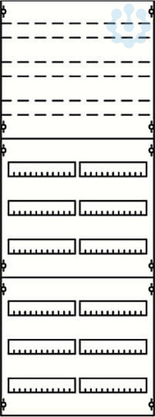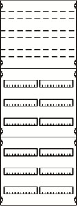 Innenausbausystem, Verteilerfelder, montiert auf EDF-Profil, für Reiheneinbaugeräte und Reihenklemmen, Rasteinheit 9 RE = 1350 mm, Feldbreite 2 = 500 mm, 216 Platzeinheiten, Reihenabstand: 125, Ausbau mit Hutprofilschiene 35 x 15 mm mit Lochung für Drahthalter, für Einbaugeräte nach DIN 43880, Abdeckungen aus Kunststoff, 90 Grad Druck-Drehverschluss, RAL 7035, Ausführung der Abdeckung: mit Ausschnitt, einsetzbar ab einer Schranktiefe von 120 mm, Verteilerfelder oder Feldkombinationen müssen die gleichen Rastereinheiten haben wie die Schränke, in die sie eingebaut werden. Bei Stand- und Reihenschaltschränken müssen zwei Felder oder Feldkombinationen übereinander eingebaut werden. Die EDF-Profilschienen sind im Lieferumfang enthalten.