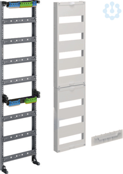 Verteilerfeld,univers Z,Höhe 1050mm,7-reihig,1-feldig,PE/N waagerecht. Innenausbau für Verteilerfelder Einbausätze für Verteiler nach Maßnorm DIN 43 870 zum Einbau in Zählerschränke System univers Z zur Stromkreisverteilung. Bestehend aus 250 mm breiten Feldern mit Traggerüst aus profiliertem Stahlblech Verteilerfelder im Rastermaßsystem mit Hutschienen 35x7,5 mm und fingersicheren PE/N-Klemmen in Stecktechnik. Abdeckhaube aus Kunststoff Höhe 300 mm oder 450 mm zur Einhaltung der Schutzisolierung, Schutzart und Berührungsschutz. Alle Hauben mit Plombierschieber zur Plombierung, integriertem Griff und 46 mm Geräteschlitz mit je 12 Platzeinheiten pro 150 mm Rasterns. Die Felder sind mit einem Rastsystem ausgestattet, das einen schnellen und einfachen Schrankeinbau ohne Werkzeug erlaubt.