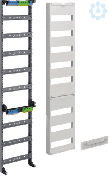Verteilerfeld,univers Z,Höhe 1200mm,8-reihig,1-feldig,PE/N waagerecht. Innenausbau für Verteilerfelder Einbausätze für Verteiler nach Maßnorm DIN 43 870 zum Einbau in Zählerschränke System univers Z zur Stromkreisverteilung. Bestehend aus 250 mm breiten Feldern mit Traggerüst aus profiliertem Stahlblech Verteilerfelder im Rastermaßsystem mit Hutschienen 35x7,5 mm und fingersicheren PE/N-Klemmen in Stecktechnik. Abdeckhaube aus Kunststoff Höhe 300 mm oder 450 mm zur Einhaltung der Schutzisolierung, Schutzart und Berührungsschutz. Alle Hauben mit Plombierschieber zur Plombierung, integriertem Griff und 46 mm Geräteschlitz mit je 12 Platzeinheiten pro 150 mm Rasterns. Die Felder sind mit einem Rastsystem ausgestattet, das einen schnellen und einfachen Schrankeinbau ohne Werkzeug erlaubt.