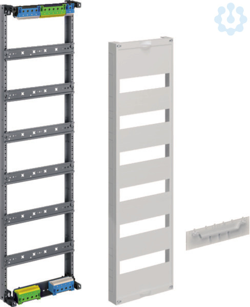 Verteilerfeld,univers Z,Höhe 900mm,6-reihig,1-feldig,PE/N waagerecht. Innenausbau für Verteilerfelder Einbausätze für Verteiler nach Maßnorm DIN 43 870 zum Einbau in Zählerschränke System univers Z zur Stromkreisverteilung. Bestehend aus 250 mm breiten Feldern mit Traggerüst aus profiliertem Stahlblech Verteilerfelder im Rastermaßsystem mit Hutschienen 35x7,5 mm und fingersicheren PE/N-Klemmen in Stecktechnik. Abdeckhaube aus Kunststoff Höhe 300 mm oder 450 mm zur Einhaltung der Schutzisolierung, Schutzart und Berührungsschutz. Alle Hauben mit Plombierschieber zur Plombierung, integriertem Griff und 46 mm Geräteschlitz mit je 12 Platzeinheiten pro 150 mm Rasterns. Die Felder sind mit einem Rastsystem ausgestattet, das einen schnellen und einfachen Schrankeinbau ohne Werkzeug erlaubt.