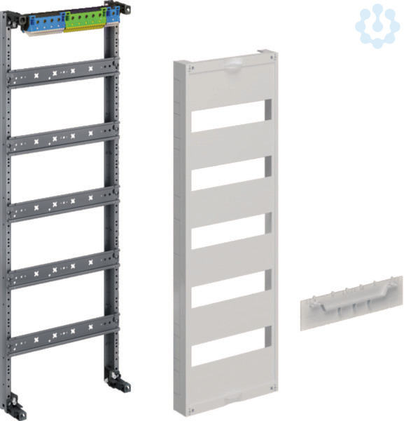 Verteilerfeld,univers Z,Höhe 750mm,5-reihig,1-feldig,PE/N waagerecht. Innenausbau für Verteilerfelder Einbausätze für Verteiler nach Maßnorm DIN 43 870 zum Einbau in Zählerschränke System univers Z zur Stromkreisverteilung. Bestehend aus 250 mm breiten Feldern mit Traggerüst aus profiliertem Stahlblech Verteilerfelder im Rastermaßsystem mit Hutschienen 35x7,5 mm und fingersicheren PE/N-Klemmen in Stecktechnik. Abdeckhaube aus Kunststoff Höhe 300 mm oder 450 mm zur Einhaltung der Schutzisolierung, Schutzart und Berührungsschutz. Alle Hauben mit Plombierschieber zur Plombierung, integriertem Griff und 46 mm Geräteschlitz mit je 12 Platzeinheiten pro 150 mm Rasterns. Die Felder sind mit einem Rastsystem ausgestattet, das einen schnellen und einfachen Schrankeinbau ohne Werkzeug erlaubt.