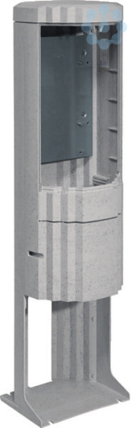 Verteilersäule, Baureihe 135, Montageplatte (300 mm x 420 mm). Verteilersäule rund, Schutzart IP 44, mit Eingrabsockel, aus glasfaserverstärktes Polyester FS 833.5 nach DIN EN 14598. Profiliertes Gehäuse im Rippendesign. Selbstverlöschende Montageplatte aus Kunststoff, aushängbare Stecktüren, Einfachschließung mit Profilhalbzylindern, Doppelschließung möglich. Die Belüftung erfolgt über labyrinthartig ausgebildete Lüftungskanäle und ist durch Eindringen von Fremdkörpern stochersicher. Eingrabsockel und Verteilersäule bilden eine Einheit. Ein Bodenrost ist empfohlen. Zur Betauungsvermeidung ist der Sockel bis zur Höhe der Kabelbefestigungsschiene innen mit Sockelfüller aufzufüllen.