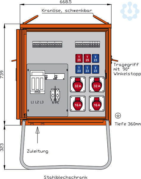 Einbauten bis einschließlich RCD-Schutzschalter im Isolierstoffgehäuse Schutzart : IP 44 Größe ca.: 739 x 669 x 360mm / H-B-T + Untergestell-Höhe ca.: 323mm Anschluss: 1 NH00-Sicherungslasttrennschalter 63A