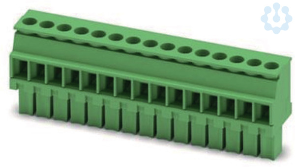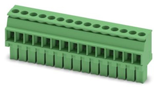 Leiterplattenstecker, Nennquerschnitt: 1,5 mm², Farbe: grün, Nennstrom: 8 A, Bemessungsspannung (III/2): 160 V, Kontaktoberfläche: Zinn, Kontaktart: Buchse (female), Anzahl der Potenziale: 15, Anzahl der Reihen: 1, Polzahl pro Reihe: 15, Anzahl der Anschlüsse: 15, Artikelfamilie: MCVW 1,5/..-ST, Rastermaß: 3,5 mm, Anschlussart: Schraubanschluss mit Zughülse, Schraubenangriffsform: L Längsschlitz, Anschlussrichtung Leiter/Platine: -90 °, Stecksystem: MINI COMBICON, Verriegelung: ohne, Befestigungsart: ohne, Verpackungsart: verpackt im Karton
