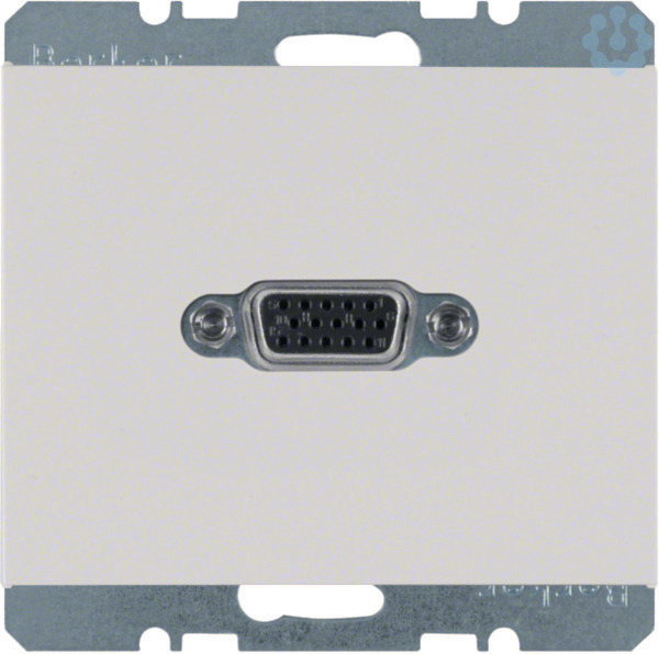 VGA Steckdose K.1 polarweiß, glänzend. VGA Steckdose geeignet zur Verbindung von z.B. PCs und Notebooks mit Anzeigegeräten, wie z.B. Monitoren (auch LCD-Monitoren) und Beamern, mit 15-poliger D-Subminiatur Doppelbuchse (vorder- und rückseitig), S-VGA kompatibel, ohne Spreizkrallen.