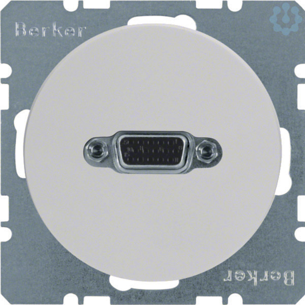 VGA Steckdose R.1/R.3 polarweiß, glänzend. VGA Steckdose geeignet zur Verbindung von z.B. PCs und Notebooks mit Anzeigegeräten, wie z.B. Monitoren (auch LCD-Monitoren) und Beamern, mit 15-poliger D-Subminiatur Doppelbuchse (vorder- und rückseitig), S-VGA kompatibel, ohne Spreizkrallen.
