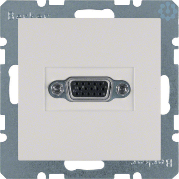 VGA Steckdose S.1/B.3/B.7 polarweiß, matt. VGA Steckdose geeignet zur Verbindung von z.B. PCs und Notebooks mit Anzeigegeräten, wie z.B. Monitoren (auch LCD-Monitoren) und Beamern, mit 15-poliger D-Subminiatur Doppelbuchse (vorder- und rückseitig), S-VGA kompatibel, ohne Spreizkrallen.