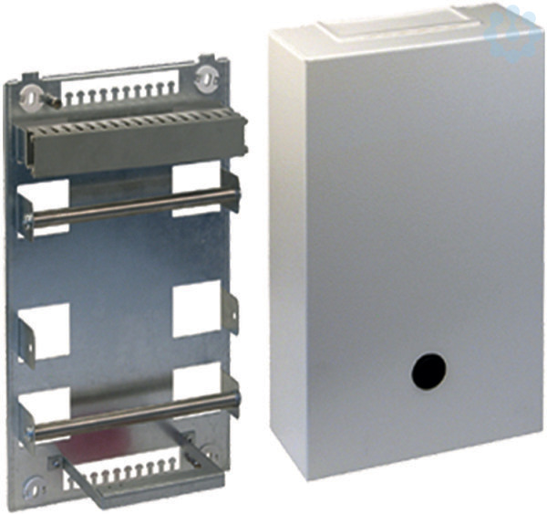 Verteilerkasten für LSA-Leisten Profil 2/10, verschließbar, Grundplatte aus Stahlblech mit Montagewanne, Haube aus pulverbeschichtetem Blech mit Kabeleinführungen oben/unten aus Kunststoff mit vorgeprägten Ausschneidekonturen, für Aufputzmontage.