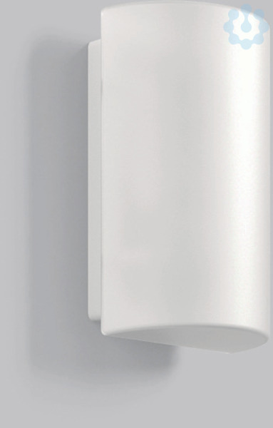 Klassische Wandleuchte mit halbrundem Glas. Armatur Kunststoff. Mundgeblasenes Opalglas seidenmatt. Glasbefestigung mit Federsystem.