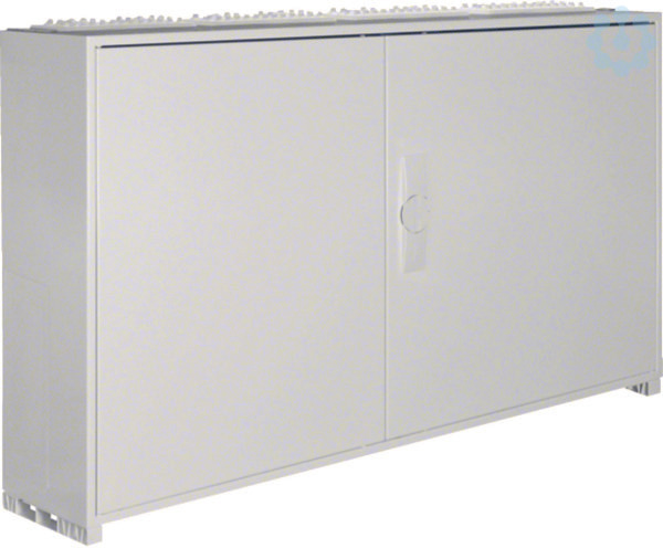 Schrank, univers, IP54/I, 650x1050x205mm, leer. Wandaufbauschrank für die Innenraummontage mit VDE-Gutachten (Fertigungsüberwachung) nach DIN EN 61439-1/-3 und Maßnorm DIN 43870, zur Aufputz-, Unterputz- oder teilversenkter Montage. Zum Aufbau einer Niederspannungsverteilung bis 400 A, 3AC 230/400 V 50 Hz. Schutzart IP54, Schutzklasse I, Luft- und Kriechstrecken nach DIN VDE 0110-1/-2. Bestehend aus Schrank mit Tür aus pulverbeschichtetem, eingebranntem, stabil profiliertem 1 mm dickem Stahlblech, Innenauskleidung aus Kunststoff. Durchsteckflansche oben und unten je Feld eingebaut, rückseitige Vorprägung im Kunststoffteil und Sammelschienendurchführungen als beidseitige seitliche Vorprägung im unteren Bereich. Tür frontbündig mit innenliegenden, justierbaren Scharnieren, wahlweise rechts oder links anschlagbar mit 110 Grad Öffnungswinkel. Tür mit Vorreiber, ab Breite 800 mm und bei allen Schränken ab einer Höhe von 1250 mm mit Stangenverschluß mit Dreipunktschließung. Hinweis: Türverschluß durch andere Schlie