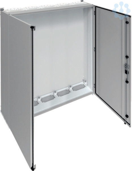 Schrank, univers, IP55/II, 1550x1300x275mm. Wandaufbauschrank für die Innenraummontage mit VDE-Gutachten (Fertigungsüberwachung) nach DIN EN 61439-1/-2/-3 und Maßnorm DIN 43870, zur Aufputz Montage. Zum Aufbau einer Niederspannungsverteilung bis 800 A, 3AC, 690 V 50 Hz. Schutzart IP55, Schutzklasse II, Luft- und Kriechstrecken nach DIN VDE 0110-1/-2. Bestehend aus Schrank mit Tür aus pulverbeschichtetem, eingebranntem, profiliertem 1,5 mm dicken Stahlblech. Durchsteckflansche oben, unten ISO-Flanschplatten mit metrischen Vorprägungen und Schnellverriegelung je Feld eingebaut. Sammelschienendurchführungen als seitliche Vorprägung. Tür aufliegend, mit innenliegenden Scharnieren, Türanschlag standardmäßig rechts, wechselbar, 110 Grad Öffnungswinkel. Serienmässig mit Schwenkhebelverschluss, DIN-Profil-Halbzylinder einbaubar. Türdichtung umlaufend geschäumt, temperaturbeständig und ölbeständig. Schrank nebeneinander und übereinander anflanschbar.