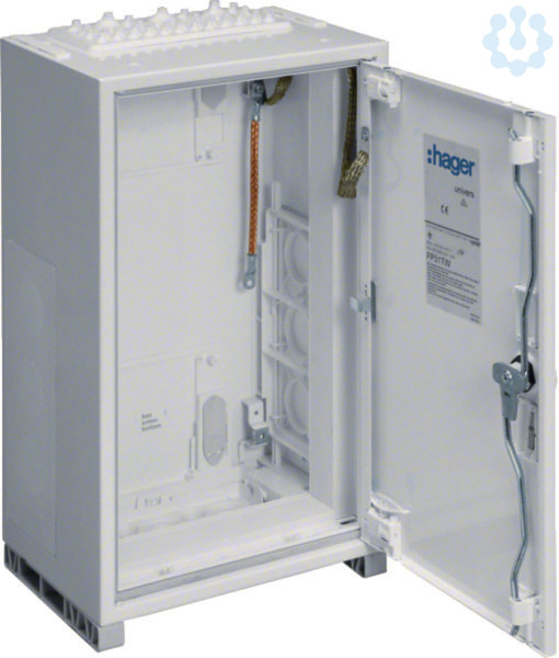 Schrank, univers, IP54/I, 650x300x205mm, leer. Wandaufbauschrank für die Innenraummontage mit VDE-Gutachten (Fertigungsüberwachung) nach DIN EN 61439-1/-3 und Maßnorm DIN 43870, zur Aufputz-, Unterputz- oder teilversenkter Montage. Zum Aufbau einer Niederspannungsverteilung bis 400 A, 3AC 230/400 V 50 Hz. Schutzart IP54, Schutzklasse I, Luft- und Kriechstrecken nach DIN VDE 0110-1/-2. Bestehend aus Schrank mit Tür aus pulverbeschichtetem, eingebranntem, stabil profiliertem 1 mm dickem Stahlblech, Innenauskleidung aus Kunststoff. Durchsteckflansche oben und unten je Feld eingebaut, rückseitige Vorprägung im Kunststoffteil und Sammelschienendurchführungen als beidseitige seitliche Vorprägung im unteren Bereich. Tür frontbündig mit innenliegenden, justierbaren Scharnieren, wahlweise rechts oder links anschlagbar mit 110 Grad Öffnungswinkel. Tür mit Vorreiber, ab Breite 800 mm und bei allen Schränken ab einer Höhe von 1250 mm mit Stangenverschluß mit Dreipunktschließung. Hinweis: Türverschluß durch andere Schließ