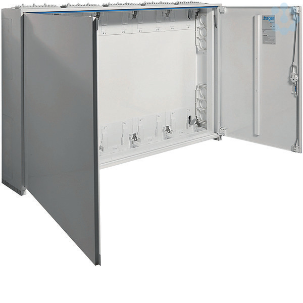Schrank, univers, IP44/I, 800x1300x205mm, leer. Wandaufbauschrank für die Innenraummontage, mit VDE-Gutachten (Fertigungsüberwachung) nach IEC 439, entspricht VDE 0660-500 und DIN EN 61439, Maßnorm DIN 43870 zur Aufputz, Unterputz oder teilversenkter Montage. Zum Aufbau einer Niederspannungsverteilung bis 355 A, 3AC 230/400 V 50 Hz. Schutzart IP44/IP54, Schutzart IP3X hinter der Tür, Luft- und Kriechstrecken nach DIN VDE 0110-1/-2. Bestehend aus Schrank mit Tür aus pulverbeschichtetem, eingebranntem, stabil profiliertem 1 mm dickem Stahlblech. Innenauskleidung aus Kunststoff. Universalleitungseinführungen oben und unten je Feld eingebaut, rückseitige Vorprägung im Kunststoffteil und Sammelschienendurchführungen als beidseitige seitliche Vorprägung im unteren Bereich. Tür frontbündig mit innenliegenden, justierbaren Scharnieren, wahlweise rechts oder links anschlagbar mit 110 Grad Öffnungswinkel. Türverschluss mit Vorreiber, ab Breite 800 mm und bei allen Schränken ab einer Höhe von 1250 mm mit (Keine Vorschlä