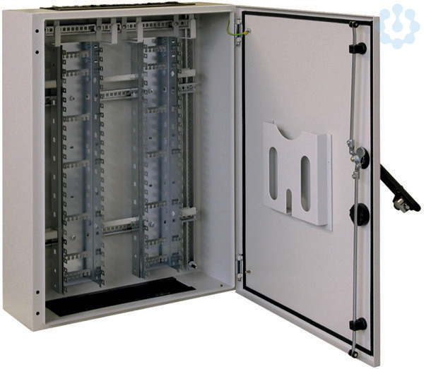 Wandverteilergehäuse für LSA-Anschlussmodule, geringer Montageaufwand durch komplett vormontiertes Gehäuse. Allseitig geschlossener, geschweißter Stahlblechschrank. Frontseitige, aufgesetzte Stahlblechtür mit innenliegenden, zugriffssicheren Scharnierstiften, Türöffnungswinkel 180°. Dreipunkt-Stangenverschluss mit Schwenkhebelgriff für Profilhalbzylinder, werkseitig mit Doppelbartschloss und zwei Schlüsseln ausgestattet. Türanschlag jederzeit wechselbar. Kabeleinführung im Dach und Boden über Bürstenleiste inkl. 2 selbsttragenden LSA-Montagekanälen, Buchtenabstände variabel, flexible Kabelführung und Rangierung durch senkrechte und waagerechte Rangierdrahtführungen, Kabelabfangung und Schirmkontaktierung im LSA-Montagekanal, konstruktionsbedingte Trennung der Kabel- und Rangierebene, Schaltplantasche aus Kunststoff an der Tür. Potentialausgleich und Erdung (VDE 0100) der Türe mit Erdungsband auf dem Chassis inkl. Wandbefestigungswinkel als Set für 4 Befestigungen.