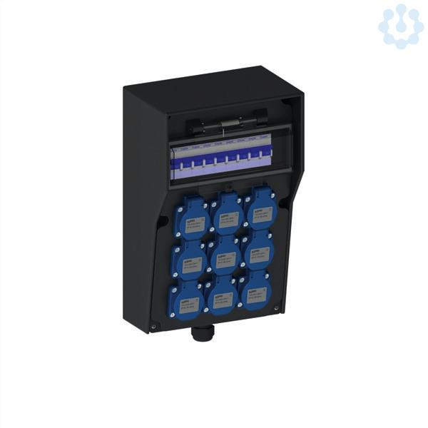 ELSPRO-Vollgummi-Wandverteiler, Baureihe REMSCHEID, Eingang: 1 Kabelverschraubung M25 von unten, Ausgang: 9 Schutzkontaktsteckdosen, abgesichert über 9 MCB 16 A/1 pol. in B-Charakteristik, Ausführung: - K2 Ausführung, - schutzisoliert und spritzwassergeschützt, - die Schutzeinrichtungen sind von außen zugänglich und liegen geschützt hinter einem Sichtklappenfenster