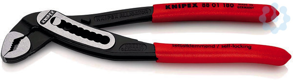 88 01 180 KNIPEX Alligator® guter Zugang zum Werkstück durch schlanke Bauform im Kopf- und Gelenkbereich. mehr Leistung und Komfort im Vergleich zu herkömmlichen Wasserpumpenzangen gleicher Länge: 9-stufige Rastenverstellung für 30 % mehr Greifkapazität. Selbstklemmend an Rohren und Muttern: kein Abrutschen am Werkstück, kraftsparendes Arbeiten. Greifflächen mit spezialgehärteten Zähnen, Härte der Zähne ca. 61 HRC: dauerhaft sicheres Greifen durch hohe Verschleißfestigkeit. Durchgestecktes Gelenk: hohe Stabilität durch doppelte Führung. Robuste Bauart, unempfindlich gegen Verschmutzung. besonders geeignet für Arbeiten im Außenbereich. Klemmschutz verhindert Quetschverletzungen. - Einstellpositionen: 9 - Kapazität für Rohre Zoll (Durchmesser): Ø 1 1/2 - Kapazität für Muttern, Schlüsselweite (mm): 36mm - Kapazität für Rohre (Durchmesser): Ø 42mm