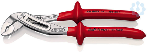 88 07 250 KNIPEX Alligator® guter Zugang zum Werkstück durch schlanke Bauform im Kopf- und Gelenkbereich. mehr Leistung und Komfort im Vergleich zu herkömmlichen Wasserpumpenzangen gleicher Länge: 9-stufige Rastenverstellung für 30 % mehr Greifkapazität. Selbstklemmend an Rohren und Muttern: kein Abrutschen am Werkstück, kraftsparendes Arbeiten. Greifflächen mit spezialgehärteten Zähnen, Härte der Zähne ca. 61 HRC: dauerhaft sicheres Greifen durch hohe Verschleißfestigkeit. Durchgestecktes Gelenk: hohe Stabilität durch doppelte Führung. Robuste Bauart, unempfindlich gegen Verschmutzung. besonders geeignet für Arbeiten im Außenbereich. Klemmschutz verhindert Quetschverletzungen. - Einstellpositionen: 9 - Kapazität für Rohre Zoll (Durchmesser): Ø 2 in - Kapazität für Muttern, Schlüsselweite (mm): 46mm - Kapazität für Rohre (Durchmesser): Ø 50mm - VDE-geprüft: Ja