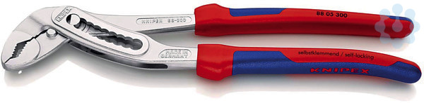 88 05 300 KNIPEX Alligator® guter Zugang zum Werkstück durch schlanke Bauform im Kopf- und Gelenkbereich. mehr Leistung und Komfort im Vergleich zu herkömmlichen Wasserpumpenzangen gleicher Länge: 9-stufige Rastenverstellung für 30 % mehr Greifkapazität. Selbstklemmend an Rohren und Muttern: kein Abrutschen am Werkstück, kraftsparendes Arbeiten. Greifflächen mit spezialgehärteten Zähnen, Härte der Zähne ca. 61 HRC: dauerhaft sicheres Greifen durch hohe Verschleißfestigkeit. Durchgestecktes Gelenk: hohe Stabilität durch doppelte Führung. Robuste Bauart, unempfindlich gegen Verschmutzung. besonders geeignet für Arbeiten im Außenbereich. Klemmschutz verhindert Quetschverletzungen. - Einstellpositionen: 9 - Kapazität für Rohre Zoll (Durchmesser): Ø 2 3/4 - Kapazität für Muttern, Schlüsselweite (mm): 60mm - Kapazität für Rohre (Durchmesser): Ø 70mm