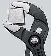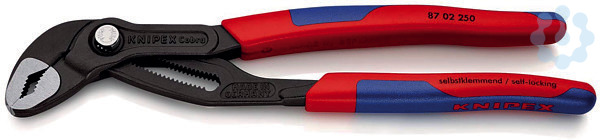 87 02 250 KNIPEX Cobra® Einstellung per Knopfdruck direkt am Werkstück. Feinverstellung für optimale Anpassung an verschiedene Werkstückgrößen und handfreundliche Griffstellung. Selbstklemmend an Rohren und Muttern: kein Abrutschen am Werkstück, kraftsparendes Arbeiten. Greifflächen mit spezialgehärteten Zähnen, Härte der Zähne ca. 61 HRC: dauerhaft sicheres Greifen durch hohe Verschleißfestigkeit. Durchgestecktes Gelenk: hohe Stabilität durch doppelte Führung. Sicheres Einrasten des Gelenkbolzens: keine unbeabsichtigte Verstellung. Klemmschutz verhindert Quetschverletzungen. mit schlanken Mehrkomponenten-Hüllen ohne Kragen für besseres Handling und einfacheren Transport. - Einstellpositionen: 25 - Kapazität für Muttern, Schlüsselweite (Zoll): Ø 2 in - Kapazität für Muttern, Schlüsselweite (mm): 46mm - Kapazität für Rohre (Durchmesser): Ø 50mm