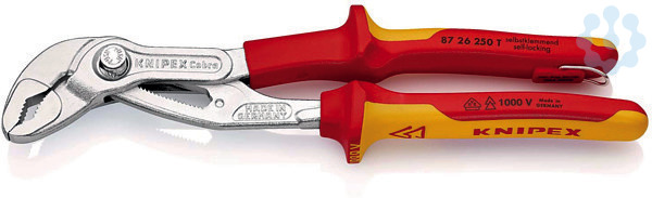 Einstellung durch Anschieben direkt ans Werkstück: schnelle, sichere und bequeme Handhabung. Feinverstellung: ermöglicht optimale Anpassung an verschiedenste Werkstückgrößen und handfreundliche Griffstellung. Gute Zugänglichkeit zum Werkstück. Selbstklemmend an Rohren und Muttern: kein Abrutschen am Werkstück, kraftsparendes Arbeiten. Greifflächen mit spezialgehärteten Zähnen, Härte der Zähne ca. 61 HRC: dauerhaft sicheres Greifen durch hohe Verschleißfestigkeit. Durchgestecktes Gelenk: hohe Stabilität durch doppelte Führung. Hohe Belastbarkeit bei schlanker Konstruktion. Klemmschutz verhindert Quetschverletzungen. Zange mit integrierter isolierter Befestigungsöse zum Anbringen einer Absturzsicherung Chrom-Vanadin-Elektrostahl, geschmiedet, mehrstufig ölgehärtet
