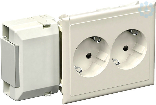 Doppelsteckdose ohne Schriftfeld fuer Kanaleinbau CYB-PS perlweiss RAL 1013: Schuko-Steckdose 2-fach 250V / 16A, Lochstellung 37°, intern durchverdrahtet, geprüft nach VDE. Halogenfreier Steckdosensatz komplett mit frontrastender Geräteeinbaudose, zwei Zugentlastungen. Geeignet zum schraubenlosen Anschluß von Leitungen bis 2,5mm².