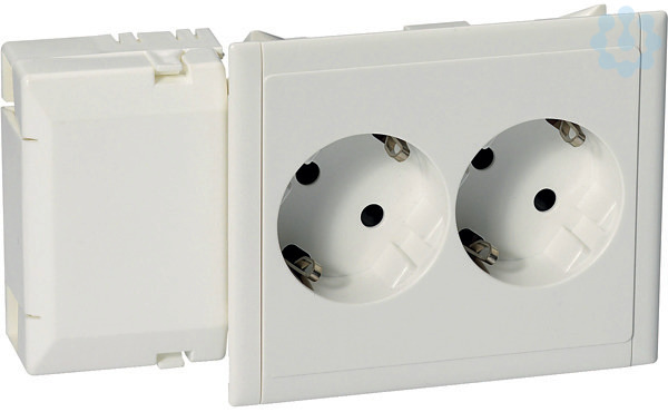 Doppelsteckdose ohne Schriftfeld fuer Kanaleinbau CYB-PS weiss RAL9010: Schuko-Steckdose 2-fach 250V / 16A, Lochstellung 37°, intern durchverdrahtet, geprüft nach VDE. Halogenfreier Steckdosensatz komplett mit frontrastender Geräteeinbaudose, zwei Zugentlastungen. Geeignet zum schraubenlosen Anschluß von Leitungen bis 2,5mm².