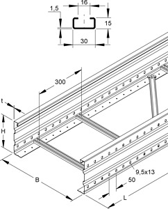 Weitspannkabelleiter, nach DIN EN 61537, mit durchgehend gelochten und gesickten Seitenholmen, sowie eingenieteten Sprossen aus C-Profil mit 16 mm Schlitzweite. Passende Bügelschellen (B... und BK...) finden Sie im KI-Katalog. Stoßstellenverbinder WSV 200.500 bitte gesondert bestellen. Abmessungen (ca. Maße) H x B : 200 x 600 mm Materialstärke : 1,5 mm Sprossenabstand : 300 mm Seitenholmlochung : 9,5 x 13 mm Lochabstand : 50 mm Bodenlochung : Ø 5,4 mm Lochabstand : 50 mm Lieferlänge : 3000 mm Nutzbarer Querschnitt : 108170 mm² Werkstoff : Stahl, bandverzinkt nach DIN EN 10346