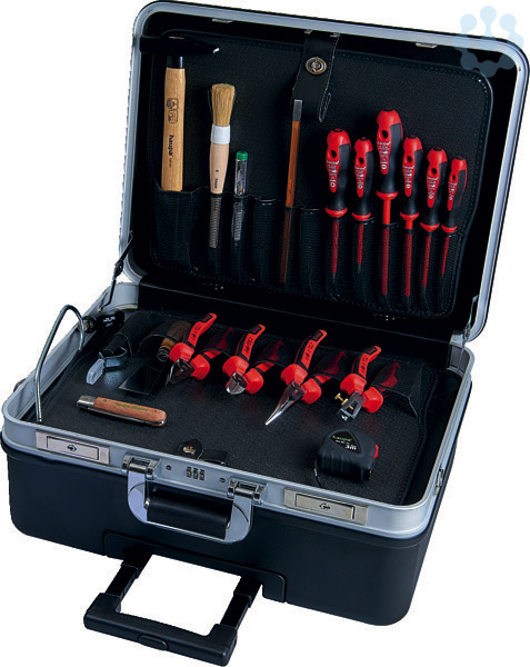 Werkzeug-Trolly ?Start-up mobil? 1000 VHartschalenkoffer, schwarz, Zahlenschloss, 1 Dokumentenfach, 2 abschließbare Schlösser, 2 Werkzeugtafeln, Bodenschale mit variablen Trennstegen, umlaufende Stoßleiste, hochwertige Beschläge. Koffer 220023.Inhalt: ? 2K-VDE-Elektriker-Schraubendreher 2,5 x 75, 4 x 100, 5,5 x 125, 6,5 x 150 mm ? 2K-VDE Kreuzschlitz-Schraubendreher PH, Gr. 1 + 2 ? 2K-Kombizange 180 mm ? 2K-Seitenschneider 160 mm ? 2K-Telefonzange 200 mm, 45° abgewinkelt ? 2K-Abisolierzange 160 mm ? Abmantler mit Hakenklinge, Ø 8 ? 28 mm ? PUK-Taschensäge mit festem Griff ? Elektriker-Meißel 10 x 250 mm ? Spannungsprüfer Klinge 50 mm ? Schlosserhammer 300 g ? Maßband 3 m ? Malerspachtel 40 mm ? Kabelmesser, 1-teilig ? Wasserpinsel