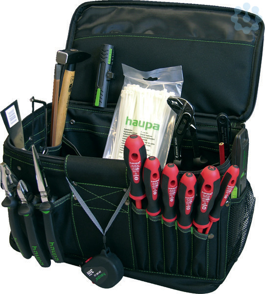 HAUPA ?TrendBox?Werkzeugtasche für den professionellen Anwender, bestückt mit 20 Werkzeugen. Mit 12 Einsteckfächern innen und 8-Einsteckfächer außen, wasserdicht und schmutzabweisend, aus hochfestem 600D-Polyester, mit ergonomischem Tragegriff für schwere Lasten, gepolstertem Tragegurt, doppelter Kreuznaht für hohe Belastung, Gurte für Wasserwaage, einfacher Zugang zu Werkzeugen und Zubehör. Farbe: grün, schwarz. Big Box 220095.Inhalt: ? 2K-Kombinationszange 200 mm ? 2K-Seitenschneider 160 mm ? 2K-Telefonzange gerade ? 2K-Wasserpumpenzange ? 2K-VDE-Schraubendrehersatz, 6 Elektrikerschraubendreher ? Kabelbinder 292 x 3,6 mm ? Schaltschrankwasserwaage ? Malerspachtel 40 mm ? Elektrikermeißel 10 x 250 mm ? VDE/GS Spannungsprüfer ? Schlosserhammer 300 g ? Superabmantler ? Maßband 3 m ? PUK-Säge mit festem Griff ? Zimmermannsbleistift