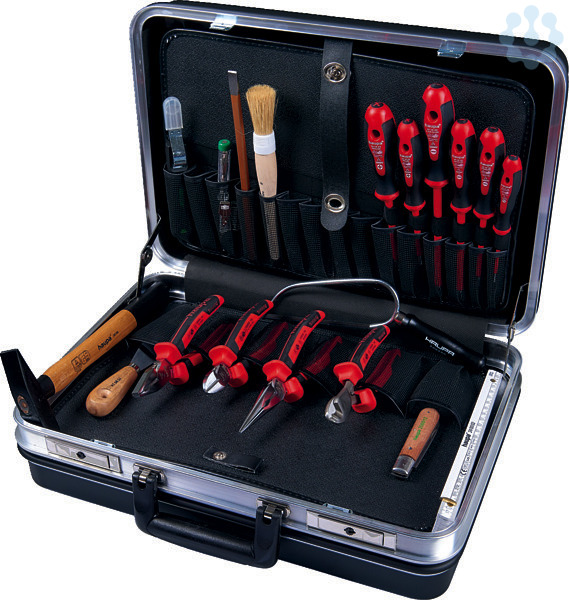 Werkzeugkoffer ?Basic VDE?Hartschalenkoffer, schwarz, abschließbar, 2 Werkzeugtafeln, eine mit Dokumententasche, Bodenschale mit variablen Trennstegen, hochwertige Beschläge, 19 Werkzeuge. Koffer 220038.Inhalt: ? 2K-VDE-Elektriker-Schraubendreher 2,5 x 75, 4 x 100, 5,5 x 125, 6,5 x 150 mm ? 2K-VDE-Kreuzschlitz-Schraubendreher PH, Gr. 1 + 2 ? 2K-VDE-Kombizange 185 mm ? 2K-VDE-Seitenschneider 165 mm ? 2K-VDE-Telefonzange 200 mm ? 2K-VDE-Kabelschneider 200 mm ? Abmantler Hakenklinge 8 ? 28 Ø ? Kabelmesser, 1-teilig ? Schlosserhammer 300 g ? PUK-Taschensäge mit festem Griff ? Elektriker-Meißel 10 x 250 mm ? Spannungsprüfer 100 - 250 V ? Maßstab 2 m ? Malerspachtel 40 mm ? Wasserpinsel