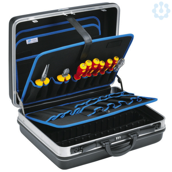 Bestehend aus: Phasenprüfer mit Kraftformheft, einpolig, VDE 0680 150V - 250V (KL19073IS), VDE-Schlitz-Schraubendreher, 4,0 x 0,8 mm (KL10010040IS), VDE-Schlitz-Schraubendreher, 5,5 x 1,0 mm (KL10012555IS), VDE-Phillips-Schraubendreher, PH1 (KL110PH1IS), VDE-Phillips-Schraubendreher, PH2 (KL110PH2IS), VDE-Plus/Minus-Schraubendreher, Z1 (KL130PM1IS), VDE-Plus/Minus-Schraubendreher, Z2 (KL130PM2IS), VDE-Seitenschneider, 160 mm (KL040160IS), VDE-Telefonzange, gerade, 205 mm (KL050205IS), Zimmermannsbleistift (KL449), Holz-Gliedermaßstab, 2 m (KL402), Schaltschrank-Schlüssel (KL500), KL850L Hartschalenkoffer, 495 x 410 x 175 mm (KL850L).