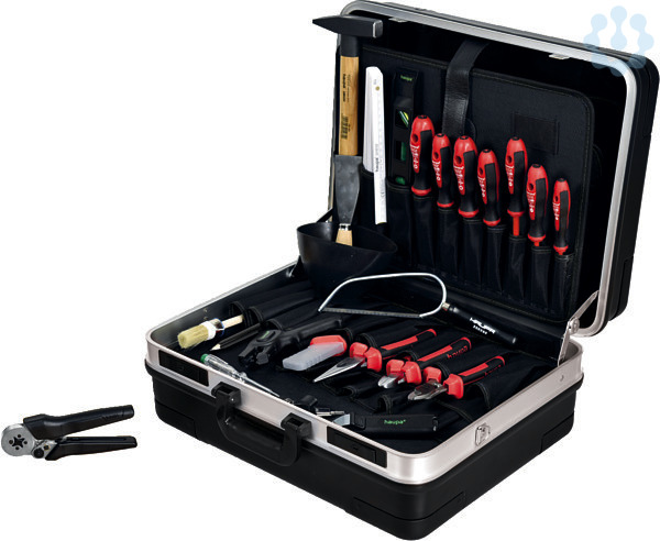 Hartschalenkoffer, schwarz, 2 Werkzeugtafeln und Dokumententasche komplett herausnehmbar, abschließbar, inkl. 2 Schlüssel, Bodenschale mit variablen Trennstegen aus Aluminium, verstärkte Metall-Ecken als zusätzlicher Schutz vor Beschädigungen, bestückt mit 22 Werkzeugen(Koffer 220030) Inhalt: VDE-Elektriker-Schraubendreher 1000 V,3 x 0,5 x 100 mm / 4 x 0,8 x 100 mm / 5,5 x 1,0 x 125 mm, VDE-Schraubendreher PH, Größe 1 + 2, VDE-Schraubendreher PZ, Größe 1 + 2, VDE-Kabelschneider 160 mm, VDE-Seitenschneider 160 mm*, VDE-Storchschnabelzange 200 mm*, Abisolierzange ?Basic? 0,5 - 4 mm², Abmantler ?Basic? ohne Hakenklinge 8 ? 28 mm2,(sicheres Arbeiten für Lehrlinge), VDE-Kabelmesser 50 mm, Sicherheitsspannungsprüfer TÜV-geprüft 0426/72, Schaltschrank-Wasserwaage 225 mm, original PUK-Taschensage, Schlosserhammer 300 g, Malerspachtel 40 mm, Gipsmulde, Industrie-Ringpinsel, Größe 4, Gliedermaßstab 2 m, Zimmermannsbleistift.