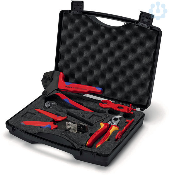 Bestückt mit Photovoltaik-Werkzeugen. Crimp-Systemzange Artikelnr. 97 43 200 A ,Crimpeinsatz MC 4 von 0,25 - 6 mm² Artikelnr. 97 49 66, Positionierhilfe Artikelnr. 97 49 66 1, Montagewerkzeug-Set Artikelnr. 97 49 66 2, Präzisionsabisolierzange 12 12 11 von mitAbisolierwerten 1,5 / 2,5 / 4,0 / 6,0 mm², Kabelschere 95 16 165