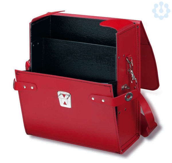 Werkzeugkoffer aus starkem Rindleder speziell für Sicherheitswerkzeuge und Schutzvorrichtungen, alle Außenkanten mit Alu-Winkeln verstärkt, Seitenteile, Vorder- und Rückwand, Boden und Deckel extra verstärkt, Vorderwand abklappbar, abschließbare Steckschlösser, Seitenverschlüsse, schwerer Stollen-Tragegriff, zahlreiche Werkzeugeinsteckfächer, seitliche Schlaufen für Schultertrageriemen, Bodengleiter mit 1 Leiterschloss, Vorderwand aufklappbar, Vorder-, Rück- und Zwischenwand mit Werkzeug-Einsteckfächern, mit Schultertrageriemen